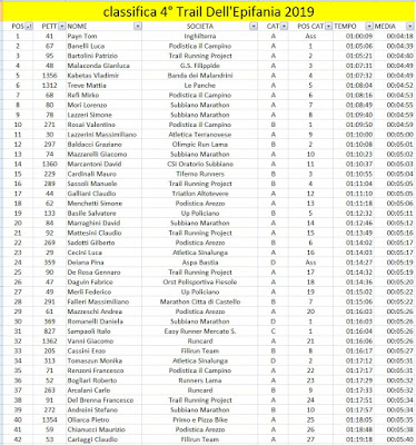 Una domenica a tutto tondo. Non è mancato niente. Al caldo delle INDOOR fino al gelo del Trail di Subbiano. Meno male che la giornata è parsa subito al bello. Iniziamo con le campestri: A Lucca era di scena il campionato Regionale di staffette a scapito del CDS . Le nostre ragazze accompagnate da Paolo Grazzini sono arrivate al 9° posto con questa sequenza di cambi Grazzini, Focardi e in ultima Cioli. Podio raggiunto. Mentrea sansepolcro vi era il campionato provinciale individuale e a squadre valido x l'accesso al CDS. Presenti sia nei Ragazzi che nelle Ragazze. Giacomo Donno reduce da un allenamento in Montan BIKE arriva 7° mostrando grinta da vendere al cospetto di ragazzi del 2006. Fra le ragazze Giacinta parte come suo solito. Non conosce la categoria ma tiene a bada facilmente Chiara Francalenci x il 2° posto. Dopo la vittoria agli studenteschi una bella conferma. Gli esordienti fanno faville. Tre categorie 3 vittorie Fidal. La gara era open. Massimo Rapini sorprende, Falini e Tarquini conferme. Bene Santini all'esordio in una distanza lunga. Benissimo all'esordio assoluto Serena Poli. Avrà preso dalla mamma o dal babbo? Ai posteri l'ardua sentenza. Leonardo Tarquini ha giostrato tutti salvo i 2 assenti dell'ultima ora Elio e Pietro. In contemporanea ad Ancona una gara di prove multiple x Samuele Zanti. Trasferta iniziata sabato con alloggio a San Gabriele (albergo). Senza neve si parte la mattina dopo colazione da Loreto. Riscaldamento e poi prima gara ostacoli.Parte male col primo ostacolo passato in ultima posizione poi rimonta. Un metro in più non permettono tre passi, poi con la settimana passata parzialmente a letto fa il 12° tempo. Pochi punti. Un po meglio nel peso 7° e passa 11° poi nell'alto fa la sua 2^ prestazione e primato al coperto. passa in 8^ posizione. nei 1000 vince la serie dei 2005 ma rimane solo e fa un 3'09"84. Niente male. Nella 2^ quella dei 2004 vanno più piano ma fanno l'ultimo giro in 30"15 e allora 3^ posizione. Risale al 7° posto. Tutto sommato da come era partito ed una settimana al gelo !!!. In palestra superati "solo" 1.40. Nella stessa mattinata si correva a Siena con la Befana a coppie con Ivan Lacrimini 5° e Francesca Barneschi 1^ di categoria insieme alla Municchi. A Firenze trofeo Sasi x Patronelli e Pialli . Entrambi al rientro e triathleti. A Subbiano Gisti Giacobbe scrive :" Stefano gara interessante ma dura con molta salita e tratti di neve e ghiaccio. Io sono partito bene ma dopo 20' mezz'ora di salita , mi hanno superato le prime 2 donne, una di Subbiano (Romanelli) e la ragazza polacca. In discesa ho perso qualche altra posizione e mi ha superato anche Yuri. Nel complesso benino ma nei percorsi lunghi mi manca al solito la tenuta. tra l'altro con il ghiaccio la discesa era un po a rischio e ci sono state cadute." questo nel pomeriggio. Poi in serata nelle classifiche assente. Forse la volata all'arrivo non è stata vista. Per la cronaca presenti Mazzini, capannini, Borgogni, Banelli , Betti , Bruschi ed Angiolini. Nella ultra di Bagnocavallo Federico santini 44° assoluto nella 45 Km. IUTA. Il resto in allenamento. La stagione sta entrando nel vivo.